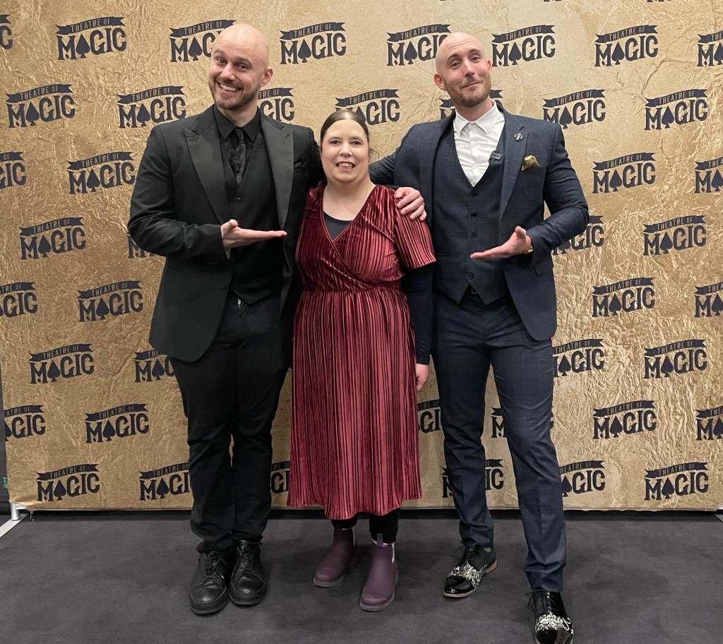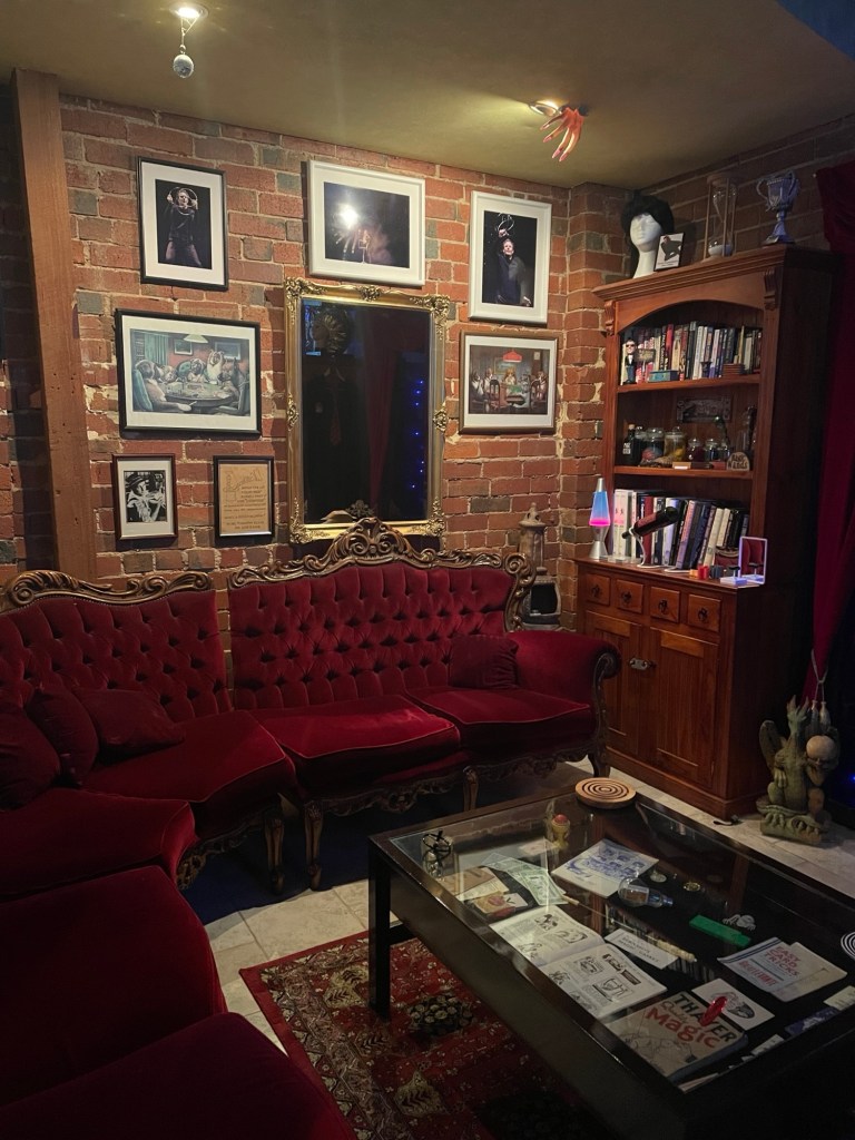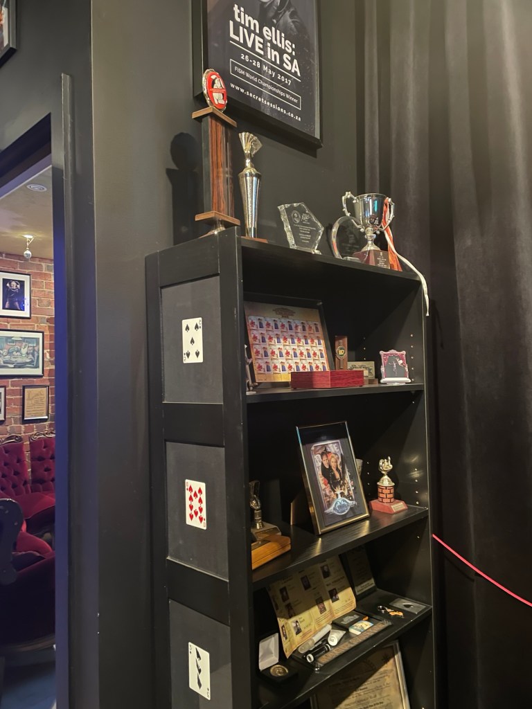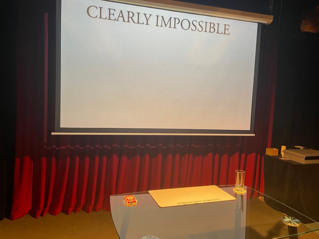 The Laneway Theatre itself is full of corners of magic curios, from intriguing art pieces, awards and certificates to props – a hot tip is to visit the toilet while you’re there as even that isn’t left out of the ‘otherworldly’ theming (as bizarre as that sounds!) Prior to the show, Tim invites audience members to look around the space, including the interesting stage setup – in this case, clear glass table, with a drinking glass, coaster and deck of cards on top. Tim commences “Clearly Impossible: Tales from The Laneway Theatre” (which I’ll abbreviate here to “Clearly Impossible”) with some amazing pieces of coin and card magic using the glass table, much to the delight and audible gasps of his audience. A weekend matinee crowd usually includes children (in this case, recommended for ages 10+) and this show was no exception, with Tim engaging in some friendly banter and ‘pick a card’ style prompts with an eager young magic fan in the front row, prompting rounds of applause and laughter from the audience. For those interested in audience participation, this show delivers in spades. As always, Tim is respectful to those not wanting to join him on stage and all on stage audience interactions with audience members are done with consent and in good spirits (there are no uncomfortable jokes or forced participation). I’m hesitant to reveal the exact magical nature of my “Clearly Impossible” adventure, however I can mention that there were some eerie predictions, a signed card or two (including by yours truly, which made me thrilled!) and more than a hat full of fun was had by all. There was much laughter, and also gasps of disbelief amongst all the comedy. I found “Clearly Impossible” to be so captivating that I scarcely took any photos during the latter portion of the show, being too enthralled by Tim’s magic to be bothering with my phone’s camera.