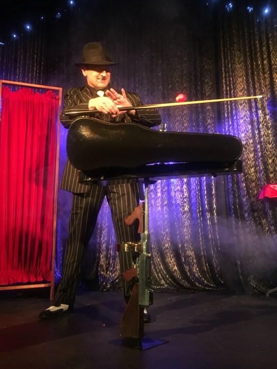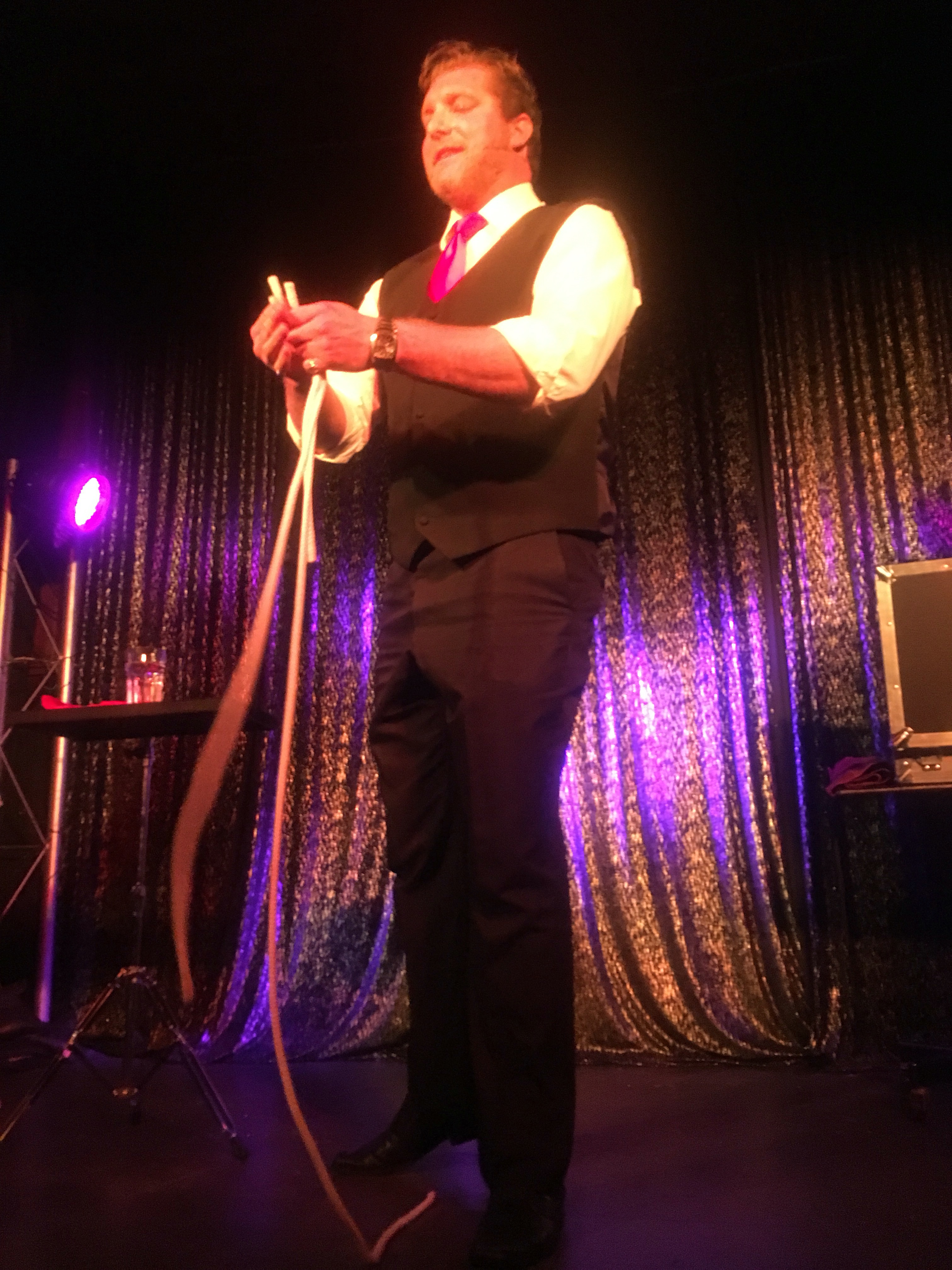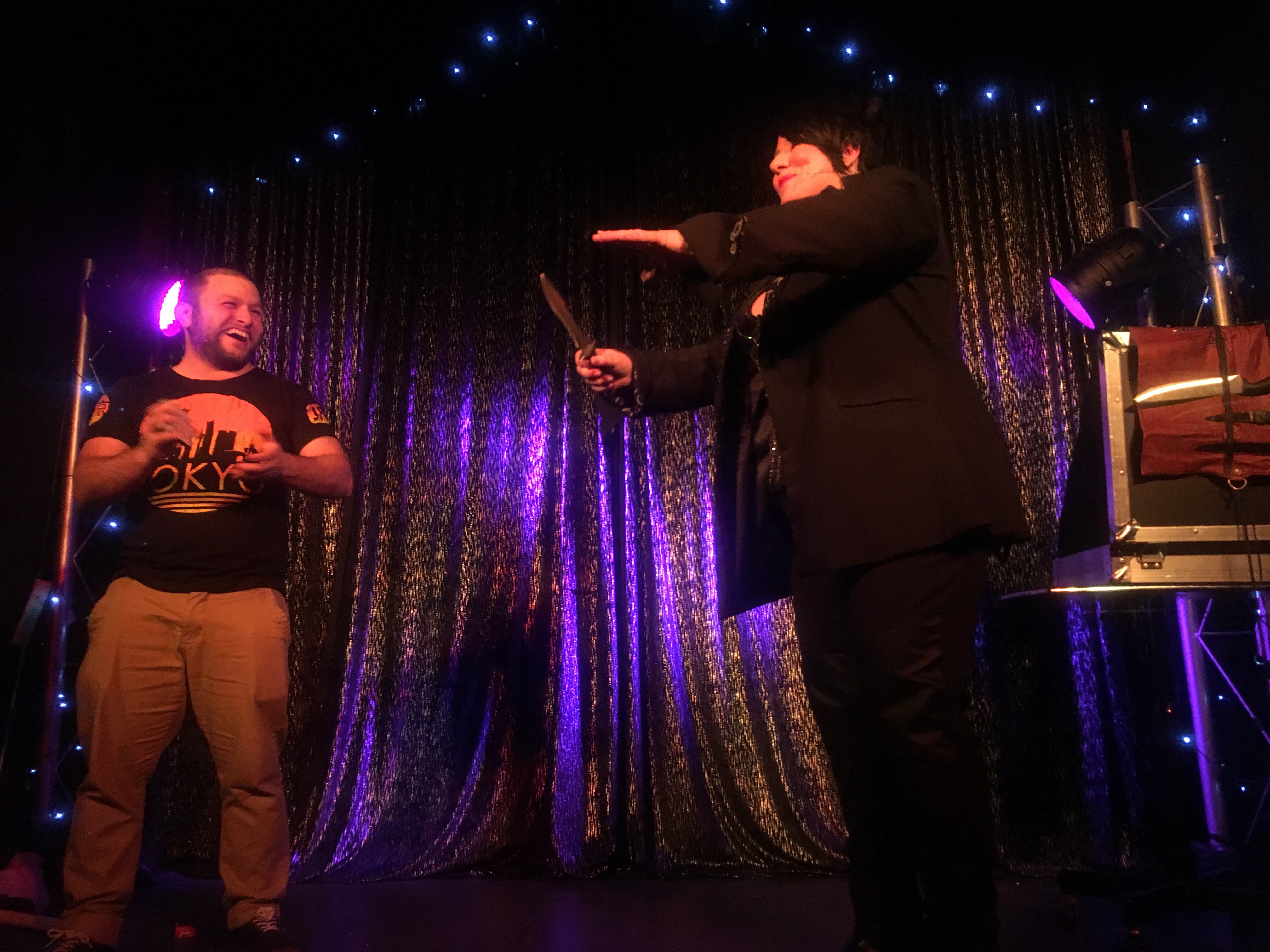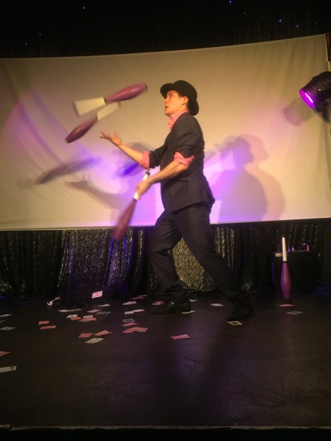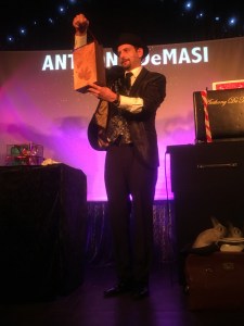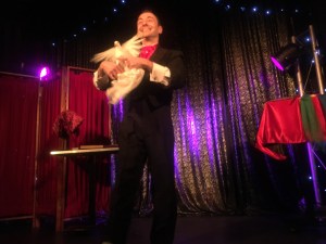 The headline act for the May show was a very popular magician in the Melbourne magic scene…in fact if you have seen magic in Melbourne it is a good chance it was the spellbinding magic of Anthony DeMasi! Anthony’s shows are never complete without his menagerie of bunny and dove friends. A friend of mine on my table was handed a bunny in a hat to cuddle, which elicited many coo’s and gentle squealing from all on the table. Anthony is so kind to let audience members mind and pat his rabbits while we all enjoy his magic. Anthony’s performances often end up being madcap journeys into the world of magic, and this performance was no different. Many moments of wonder were created through Anthony’s magic with serviettes, rope, cards and plenty of gags. This style of magic (and great use of the stage space) gives a surreal aspect to the performance. Anthony’s magic takes me to another place, so if you ever get a chance to see him perform please take that opportunity!