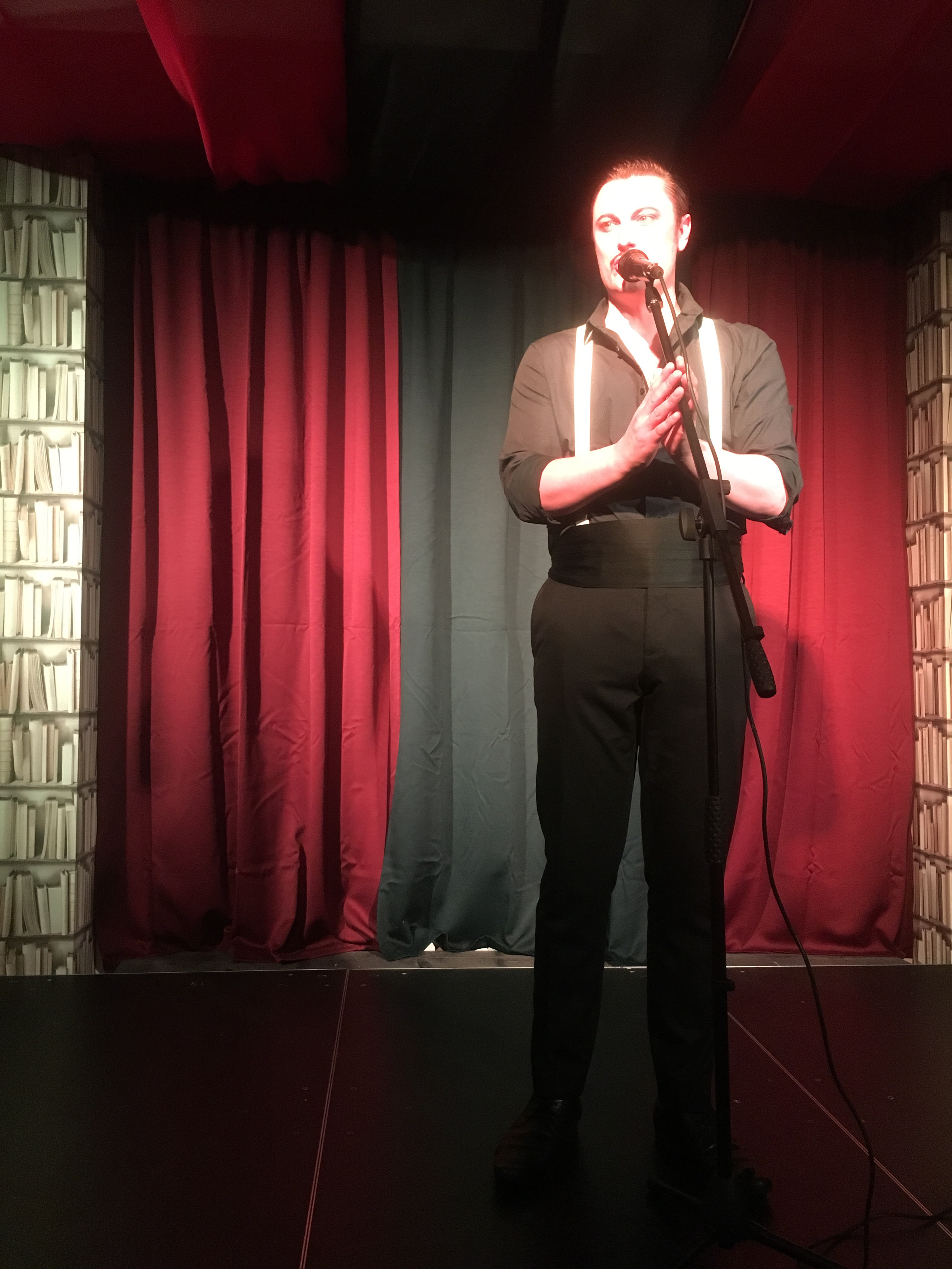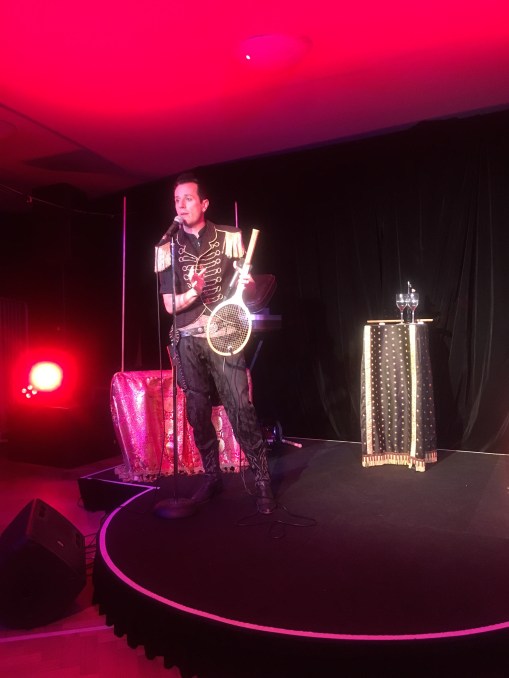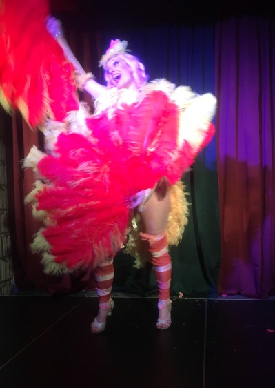 Interval time was suddenly upon the audience, and I used the time to speak to some of my friends in the audience and to see how my man was finding the show. I had not told him many details about the show, and he has only seen burlesque shows twice so far. I was pleased to see that he was enjoying the evening and appreciating all the different performance styles that were on offer, along with the various costumes. Interval time was quite generous, leaving ample time for audience members to get a drink from the well stocked bar, go to the bathroom or have a smoke (or all three!). Chante Dumont reappeared after interval to the delight of the audience, to sing classic songs and to share his unique brand of comedy. His singing voice was rather enchanting and took me away to another place and time. Unbeknown to me, for the rest of the show each performer seen in the first half returned with a completely different character and routine! I found this impressive as I could see how much effort each artist had put into their performances during the first half of the show.