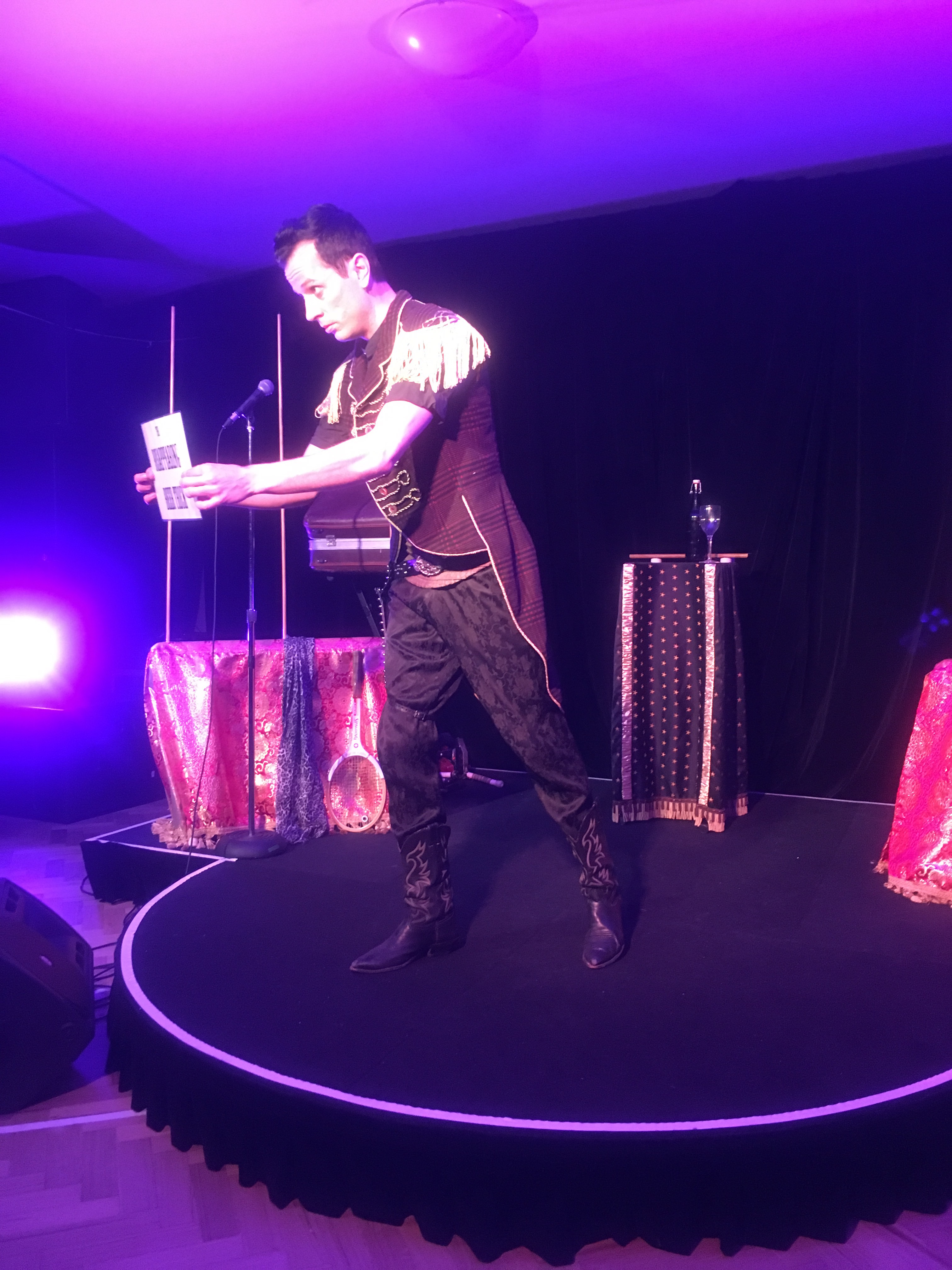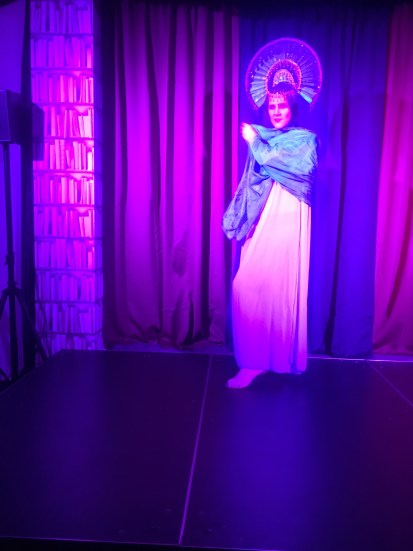 I was delighted to find the first performer of the second half to be Chastity de Vice! This time she appeared as a siren – the type of mythical creature that lives in the ocean, tempting men to their death. Chastity wore an elaborate headdress and used silk fans during her performance that mimiced the waves of the ocean. Chastity’s act was alluring and mesmerising, with her steady gaze and seductive silk fan routine. Chastity pulled all those in the audience under the waves with her, to the depths of seduction.