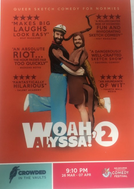 It’s March and thus Comedy Festival season in Melbourne. This season, I was very excited to see the hilarious duo behind “Woah, Alyssa! 1” – Filip Lescaut and Colwyn Buckland – had made a return to the festival with their new sketch comedy adventure “Woah, Alyssa! 2”.