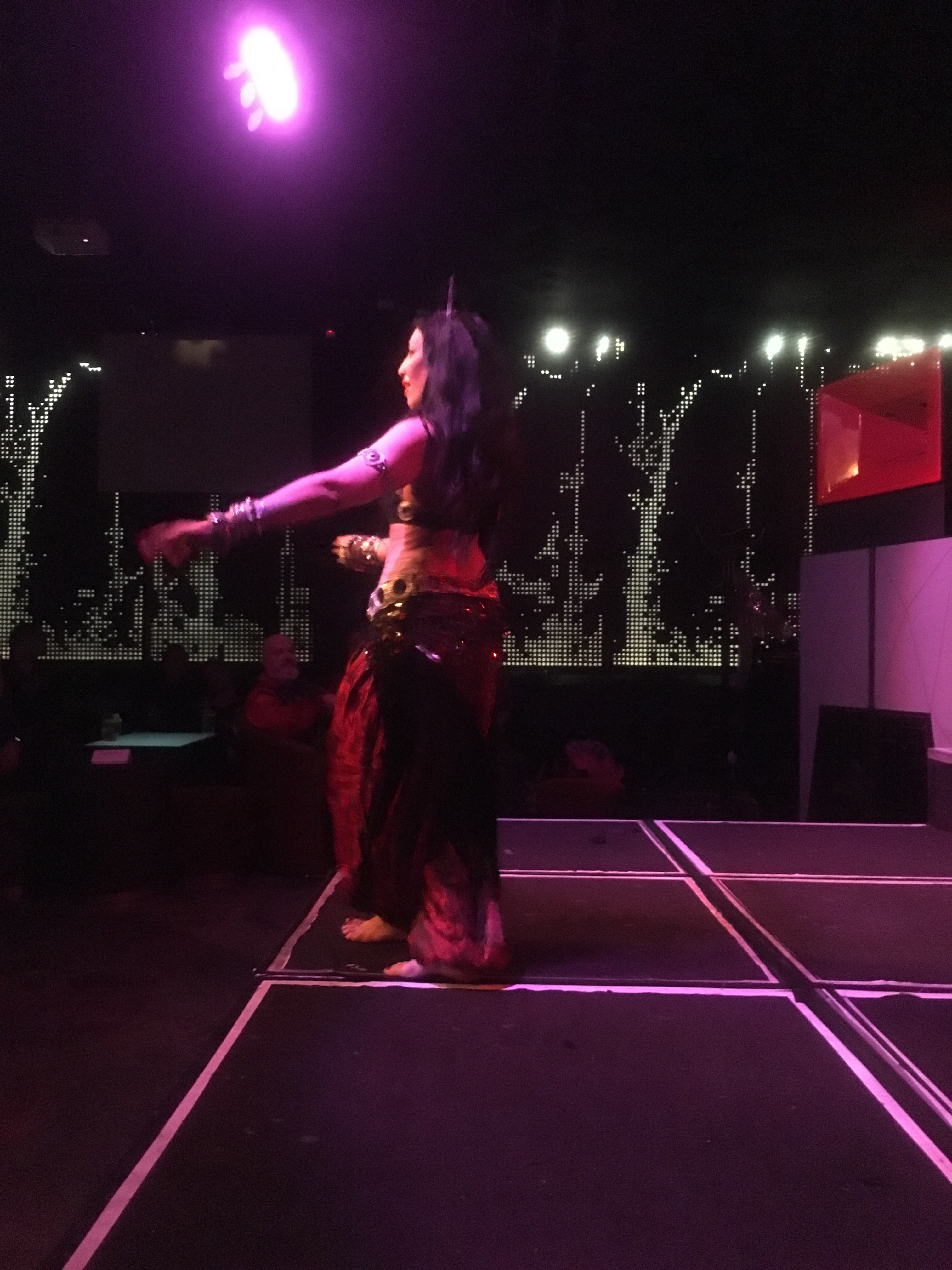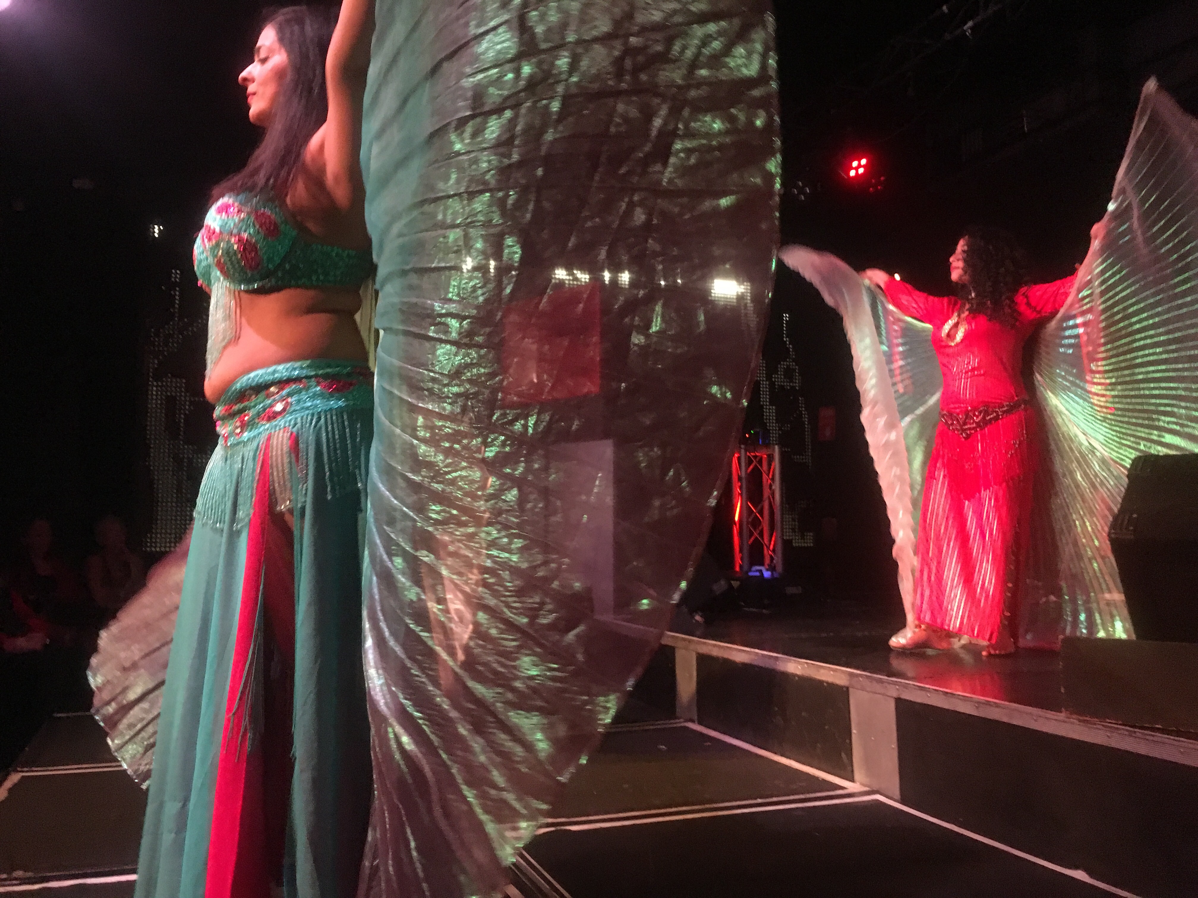 The Quizzical Mr Jeff was a highlight of the evening with his sublime manipulation, juggling and surprise productions. Fast paced and fantastic, when The Quizzical Mr Jeff is onstage you do not want to be looking anywhere else! Throughout the evening, the audience was introduced to many dancers, however they were all a highlight for me – whether it was dancing with swords or pretty flowing garments, or the usual bellydancer’s skirt that jingles, it was so easy to get carried away with the rhythm and spectacle of it all. Ronicka and Ayfer are wonderful to behold as a duo, as much as when they are solo performers. I much enjoyed Afyer’s dancing in tall heels, with her sassy dramatic hair flicks. Ronicka’s precision and strong poses were equally as captivating. Azra and her belly dance school were a delight. Azra’s solo performance was beautiful and exciting as she held all the eyes in the room. Dancers from her school were joyful, energetic and brought a whirling, whimsical feel to the evening. During their performance, we may as well have been in a courtyard in Morocco or in a far away place. All the dancers of the evening were spellbinding.