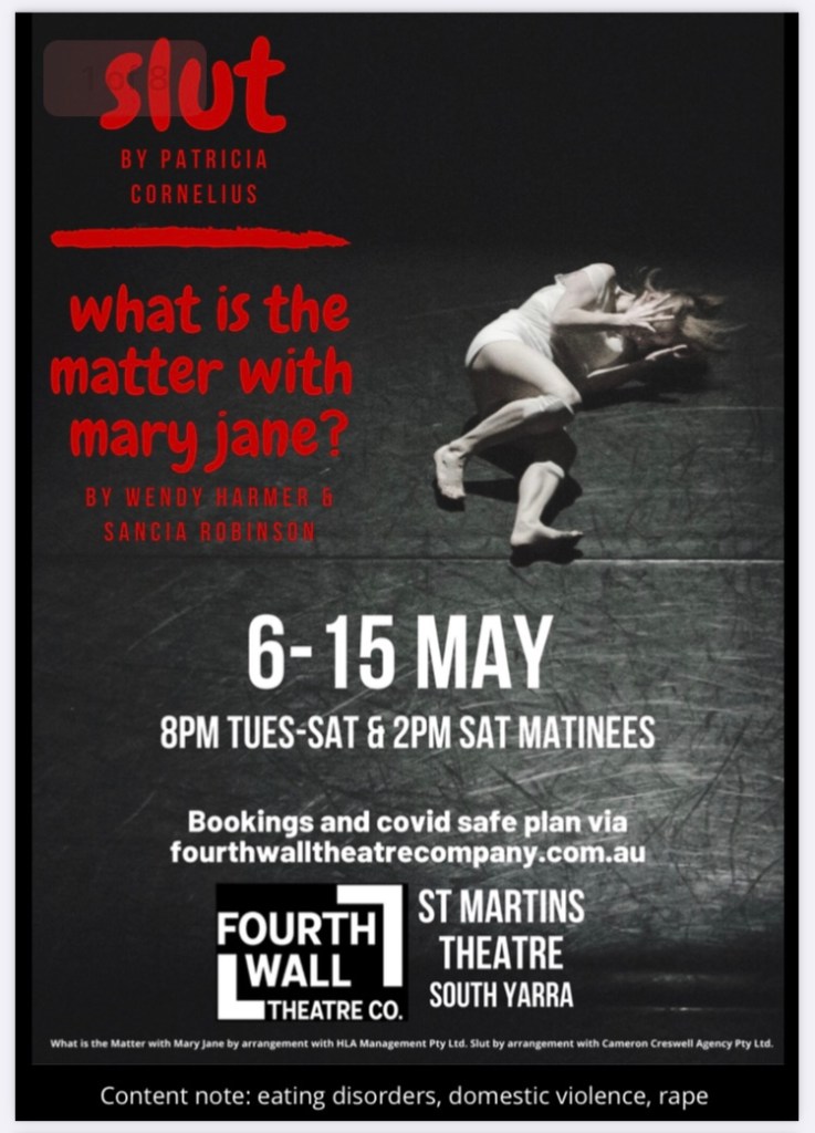 Tucked away from the bustling main streets of inner city suburb South Yarra and found down a leafy side street is St Martins Theatre. On a picture perfect Autumn afternoon, I attended Fourth Wall Theatre Company’s double feature of “What is the matter with Mary Jane? by Wendy Harmer and Sancia Robinson and “Slut” by Patricia Cornelius. The theatre and staff are both very welcoming and I was excited to sit down for what transpired to be a set of poignant performances focused on pertinent topics in society.