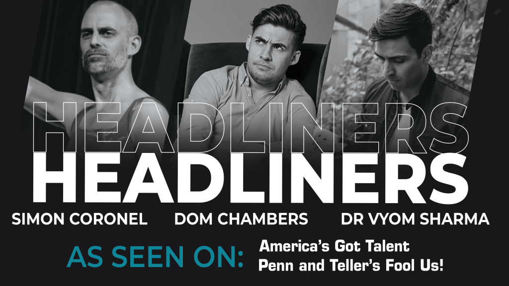 This final spotlight is for a show, rather than a performer (or performers). The show is “Headliners” and it stars three legendary, well known magicians who have all been on TV – Simon Coronel, Dom Chambers and Dr. Vyom Sharma! “Headliners” is a highly anticipated magic show, which is sure to be full of jaw dropping moments and world class magic. I sat down with the stars of “Headliners” to learn more.