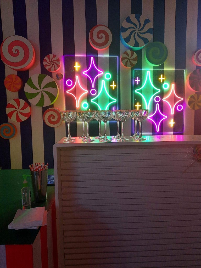 The treats portion of the event, well, the setup was like something out of Willy Wonka! It was great to delight in my inner child and go moderately wild and eat all kinds of sweets – we even had a doughnut each which was fresh and delicious. The only wish we had here is that they had given us cups / small bags to load our treats in. It was very easy for hands to become sticky and we were told not to be too greedy (so there were treats left for other groups) and I feel that attendees perhaps took less treats / were more strict on quantity due to that. It would have been much easier to police and enjoy if we each had a cup to fill. We were given time to wander around and ample time for photos, which we appreciated. The actors (and other guests) were happy to help with photos which was lovely too. Everyone at the (family friendly) session we went to were lovely, adding to the afternoon of treats we all shared. The family friendly nature of the event did not diminish the drinks on offer – it simply slightly altered the actors’ scripts.